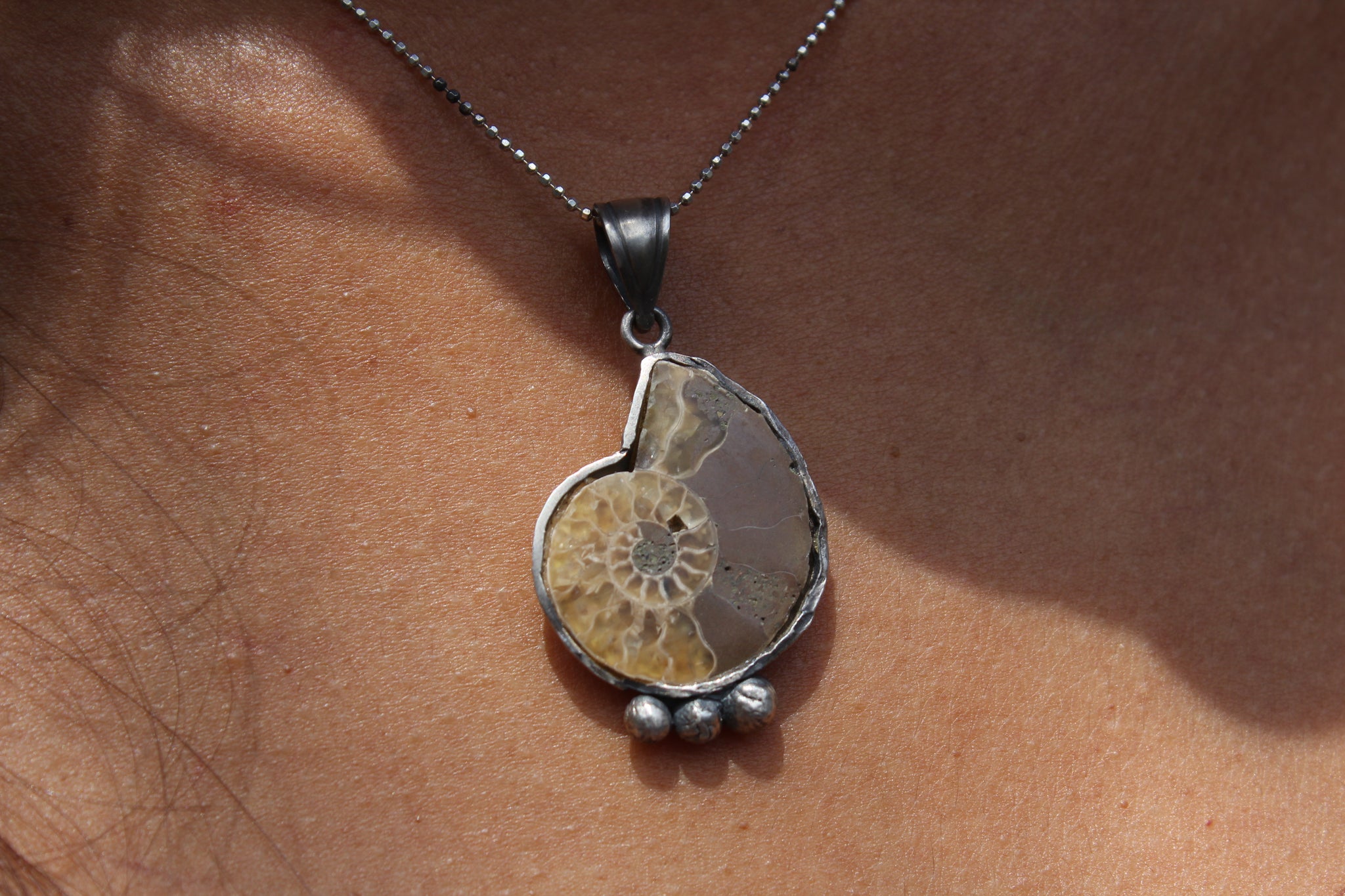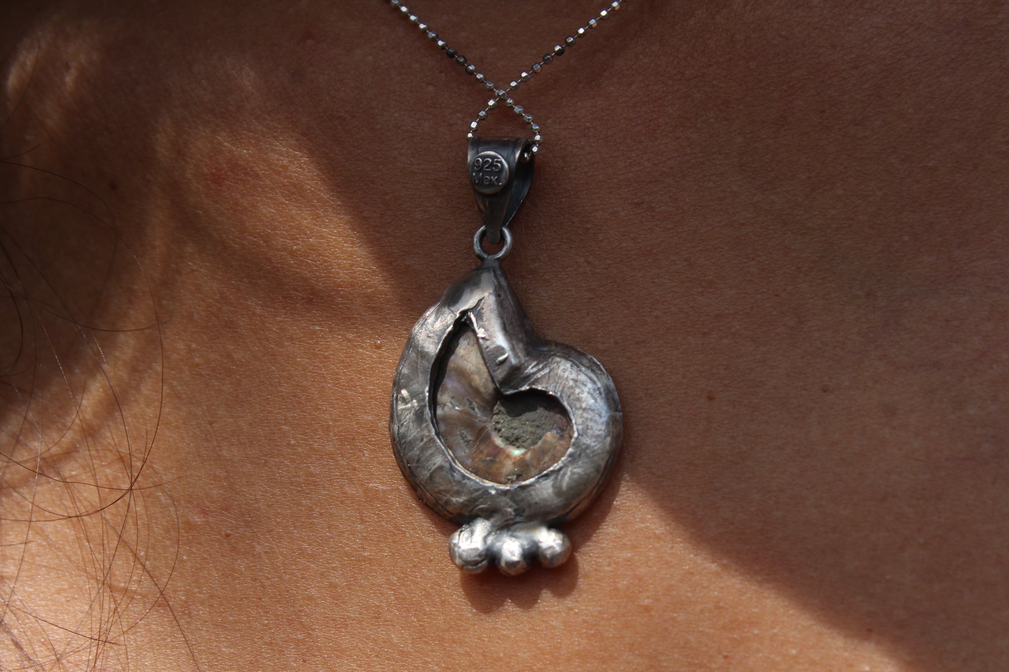 Dije de plata .925 artesanal con Amonite, es una especie de Fósil. Incluye cadena de plata 925.Dije de plata 925 con terminado patinado. Producto realizado por artesanos mexicanos.